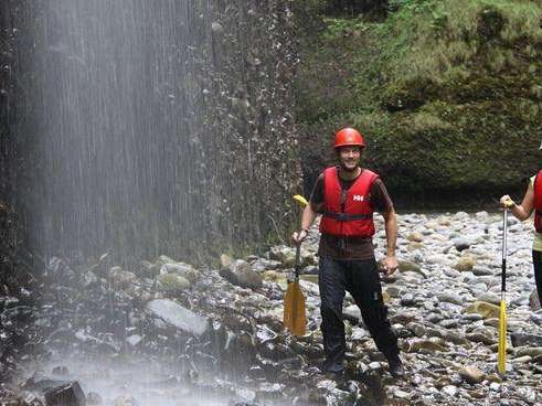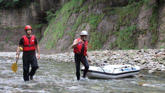 - Velo-Helm oder Kletterhelm, Badekleider, darüber eine Regenhose als Beinschutz, T-Shirt, evtl. leichte Regenjacke, Wasserschuhe zum binden (oder alte Turnschuhe), trockene Kleidung.