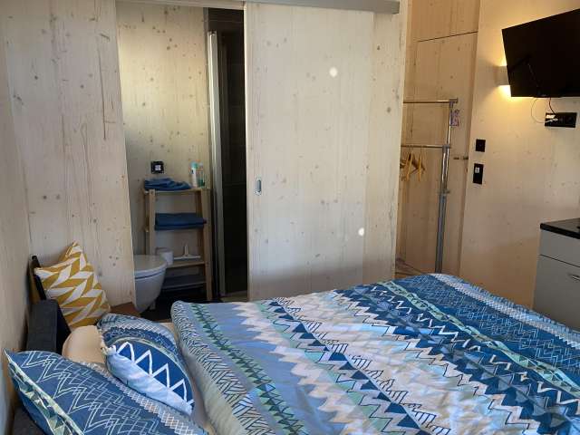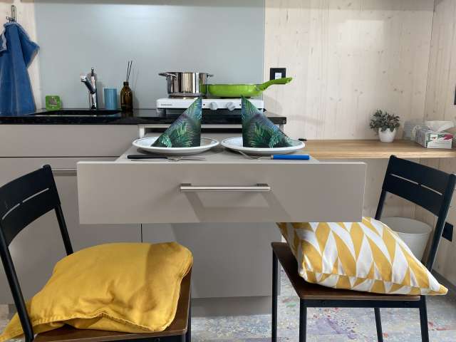 Das sehr kleine Studio (13m2) mit privatem Eingang wird für eine oder zwei Personen vermietet. Das Bett (140 x 200 cm) ist mit einem Handgriff im Nu in ein Sofa verwandelbar, um mehr Platz zum Kochen zu schaffen.