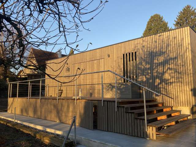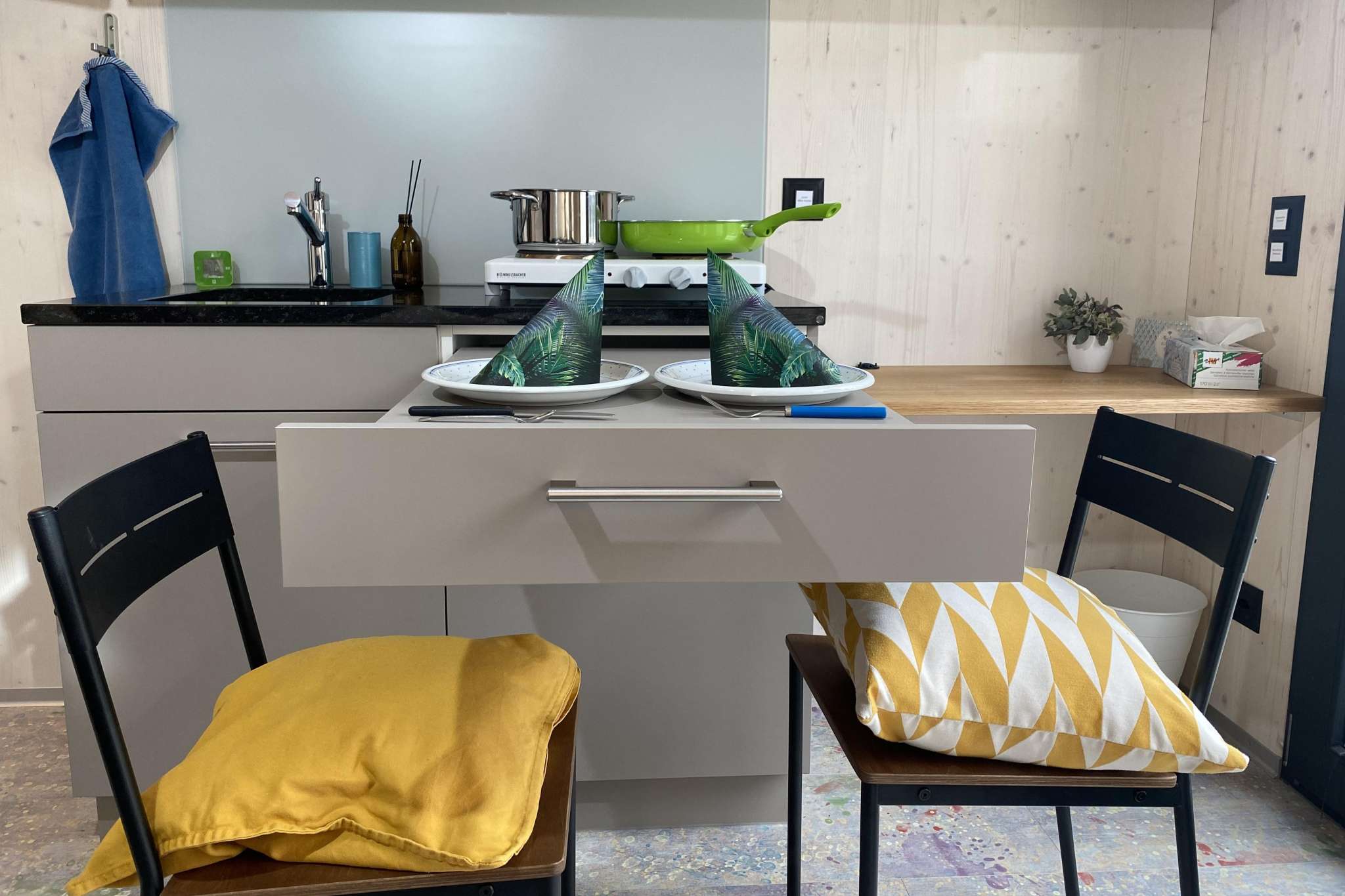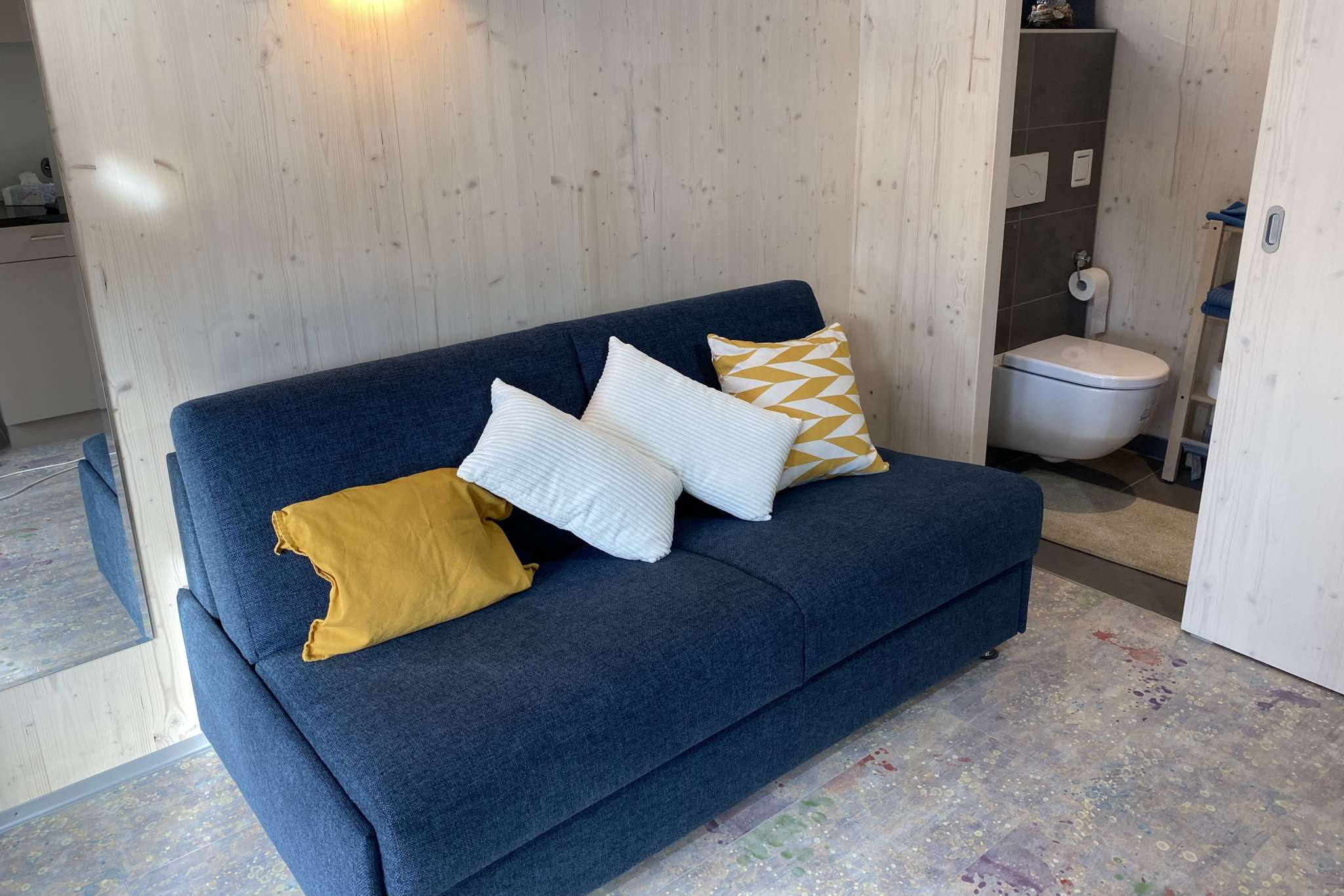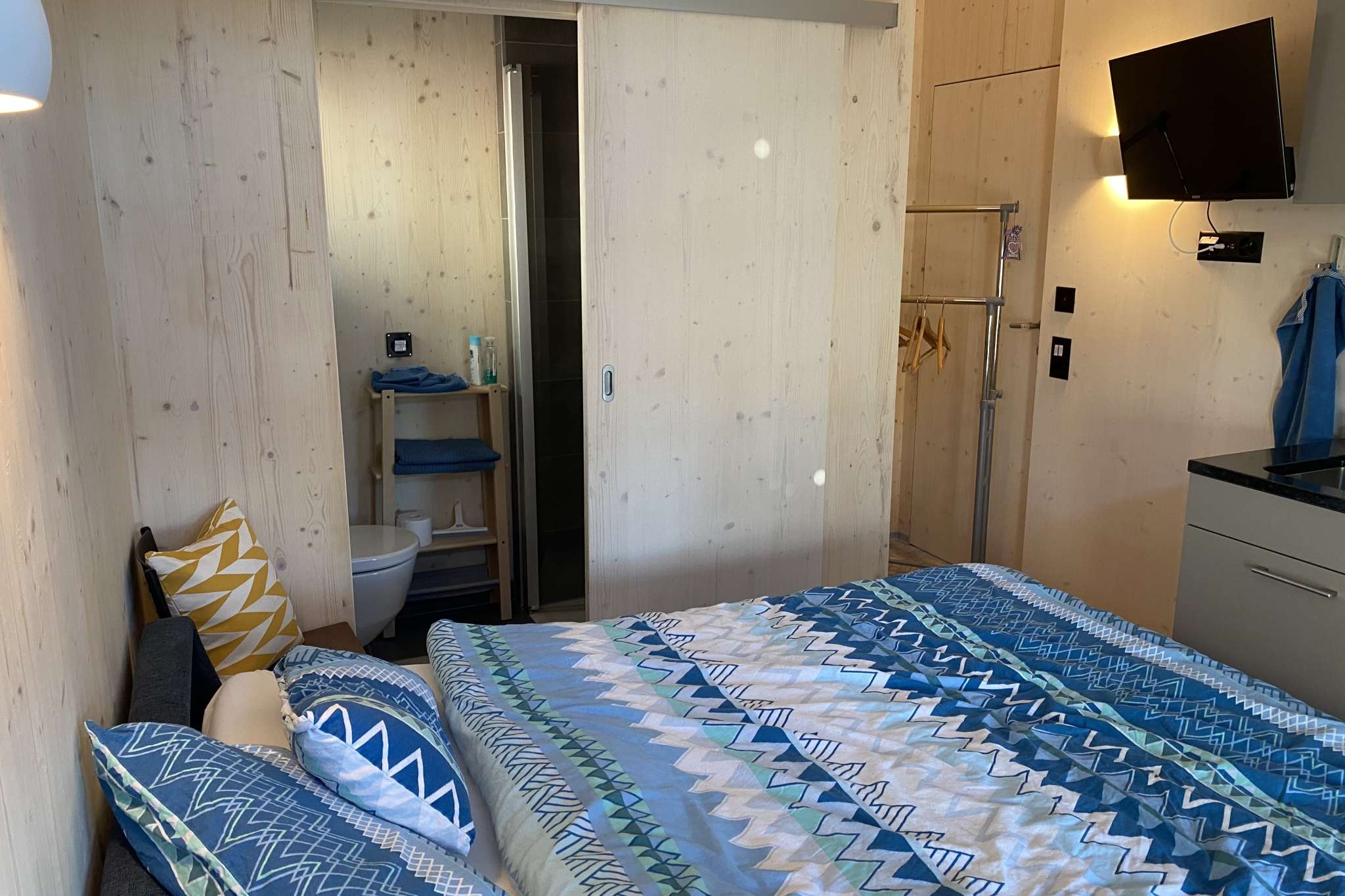 Verfügbar sind WLAN, ein Schreibplatz, ein Fernseher und ein Terrassensitzplatz. Eine eigene Dusche/WC, Bettwäsche mit Frottiertüchern, Föhn und Haarshampoo sind vorhanden. In der einfachen Küche stehen ein Elektroherd mit zwei Platten, ein kleiner ausziehbarer Esstisch, Geschirr, Besteck, Pfannen und ein kleiner Kühlschrank zur Verfügung. Eine Kaffeemaschine und ein Wasserkocher sind auch vorhanden. Möchten Sie vor Ort einkaufen, ist auch ein Metzger und ein Volglädeli innert 250 Metern erreichbar.
