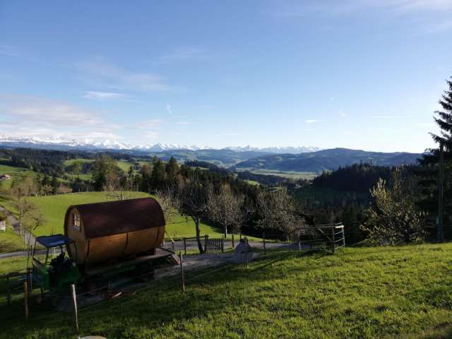 Das Fass ist oberhalb des Bauernhofes in einer Weide zwischen Bäumen platziert und zu Fuss erreichbar. Es liegt 40 Meter vom Hof entfernt. Ab und zu sind eine Mutterkuhherde oder Ziegen auf der Weide. Doch was gibt es herrlicheres als bei Glockengebimmel einzuschlafen!? Idyllisch wie bei Alpöhi und Heidi - dazu geniessen Sie den Sonnenuntergang und die Weitsicht über das Emmental. Wenn Sie mit dem Auto anreisen, können Sie das Auto auf dem Hof Ober Mörisegg parkieren. Auf Wunsch holen die Gastgeber die Gäste am Bahnhof Zollbrück ab. Zu Fuss erreichen Sie den Hof ab Bahnhof Zollbrück in 1.5 Std. Oder ab der Lüderenalp Richtung Zollbrück auf einer wunderbaren Höhenwanderung in 1.5 Std.