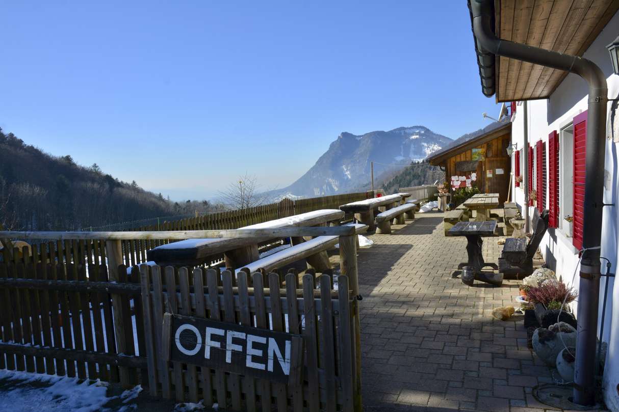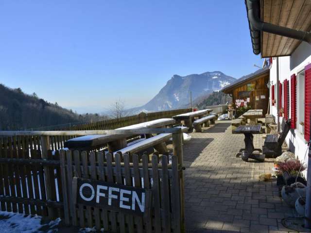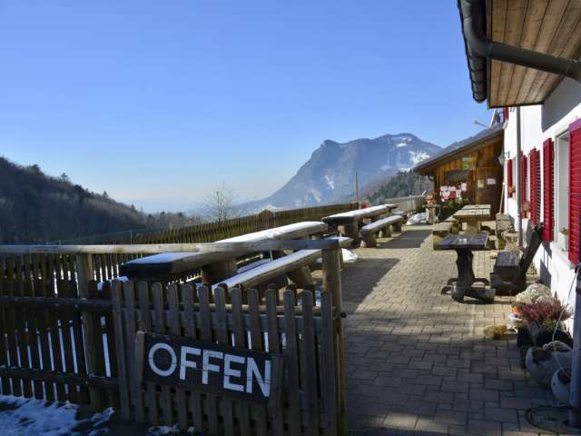 Die Gaststube mit heimeliger Atmosphäre und die Terrasse mit wunderschöner Aussicht. Die Spezialität des Restaurant ist das Zvieriplättli und der hausgemachte Hinterwälder-Käse.