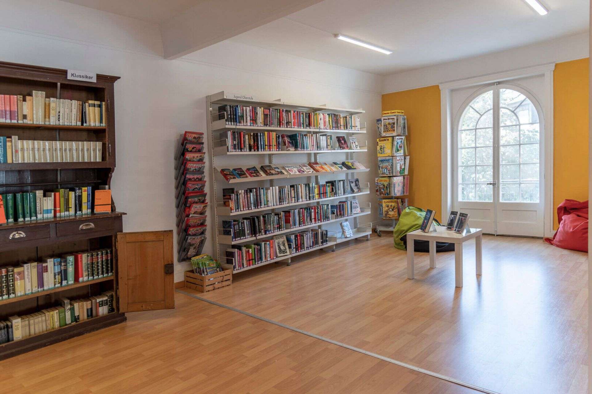 Die Bibliothek befindet sich beim Rössliplatz im ehemaligen Doktorhaus. Im Parterre und der ersten Etage - inklusive Behindertenlift und Rampe für Rollstuhlfahrer - lässt es sich in den komplett neu renovierten, grosszügigen Räumen wunderbar verweilen.Der Wohnstock im Stil des Spätbarock wurde um 1795 erbaut. Bis 1930 stand an der Stelle der Bernstrasse 17 ein Ökonomieteil mit Stall, Werkstatt und Heubühne. Erst dann kam der Richtung Baslerhof gelegene heutige Geschäftshausteil, in den nun die Bibliothek einzieht, samt dem kleinen Balkon auf den Rössliplatz hinaus im sogenannten späten Heimatstil dazu.
