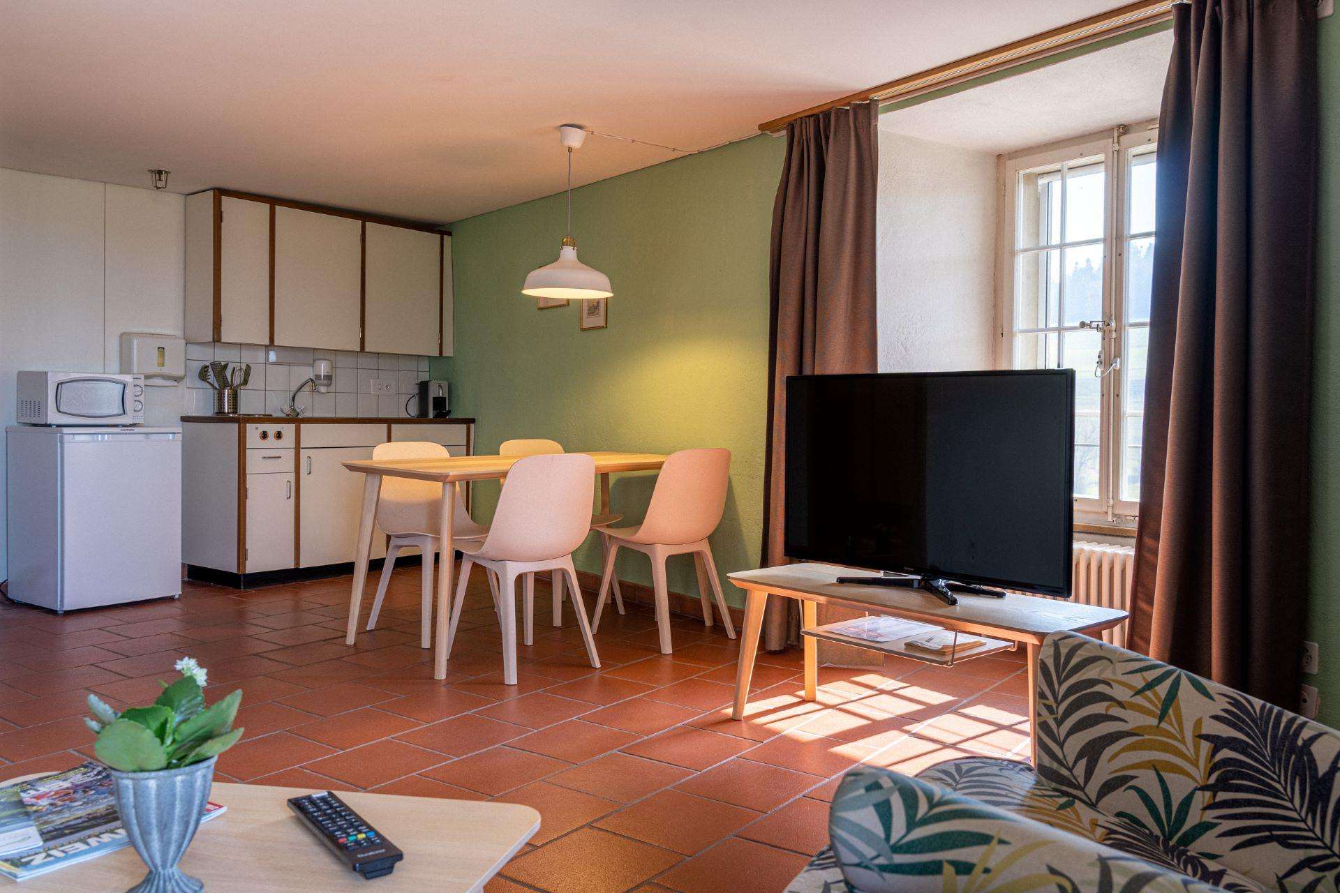 • Aufenthaltsraum inkl. Küche, Esstisch, Sitzecke und TV (Verfügbarkeit nicht garantiert)