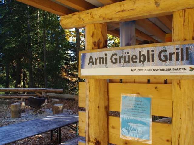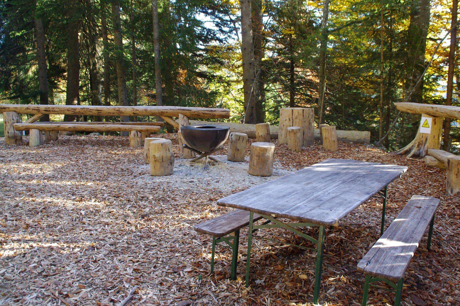 Etwas unterhalb hat die Wirtefamilie Reist eine wunderbare Feuerstelle gebaut. Beim modernen Stahlgrill stehen Tische und Bänke für rund 40 Personen. Zudem hat es einen grossen Unterstand mit Brennholz, Beil, Anzündhilfen und sogar Spielsachen für die Kleinen. Der Grill eignet sich übrigens auch für ein Waldfondue: Pfanne und lange Gabeln (jedoch kein Käse und Brot) können auf Vorbestellung direkt in der Alpwirtschaft bezogen werden.