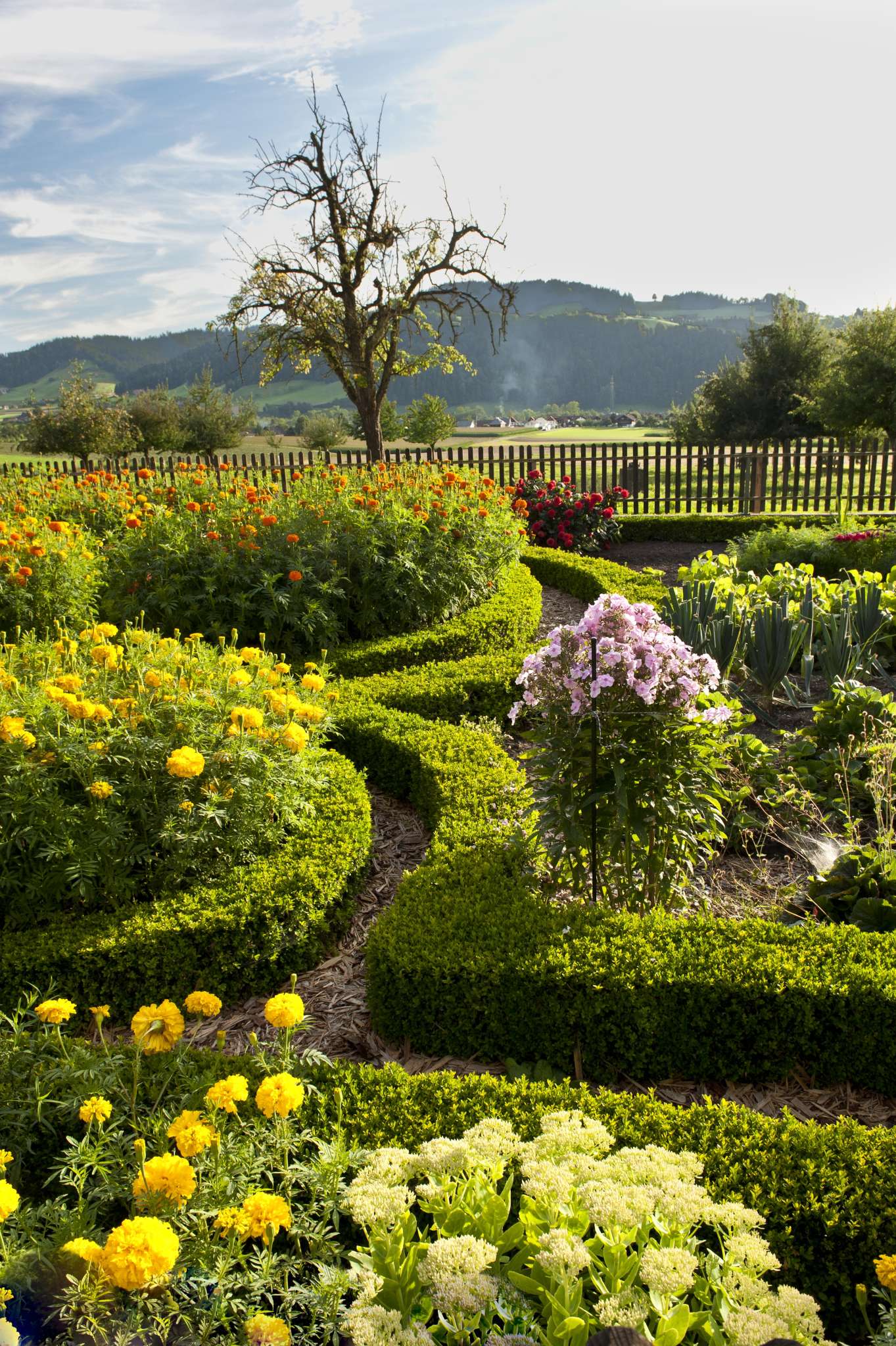 Besonders reizvoll an Emmentaler Bauerngärten ist die Verbindung von Nützlichem und Schönem. Die sorgfältig geschnittenen Buchsbaumeinfassungen lassen diese Gärten zu jeder Saison ordentlich und schön aussehen. Die symmetrischen Wege sind praktisch und wenn im Sommer Blumen sowie Gemüse überborden, sorgen sie immer noch für Struktur und für ein Gefühl von Ordnung. Die Wege werden stets sauber eingefasst und oft mit Rindenmulch belegt.