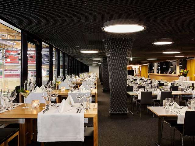 Im 3. Obergeschoss bietet die Jakob-Galerie einen exklusiven Blick auf das Eisfeld. Diese stilvolle Location ist ideal für komfortable Veranstaltungen und eignet sich für bis zu 220 Personen. Perfekt für Business-Lunches, festliche Anlässe, Kunden-Events, Seminare, Versammlungen, kleinere Vorträge und Ausstellungen.