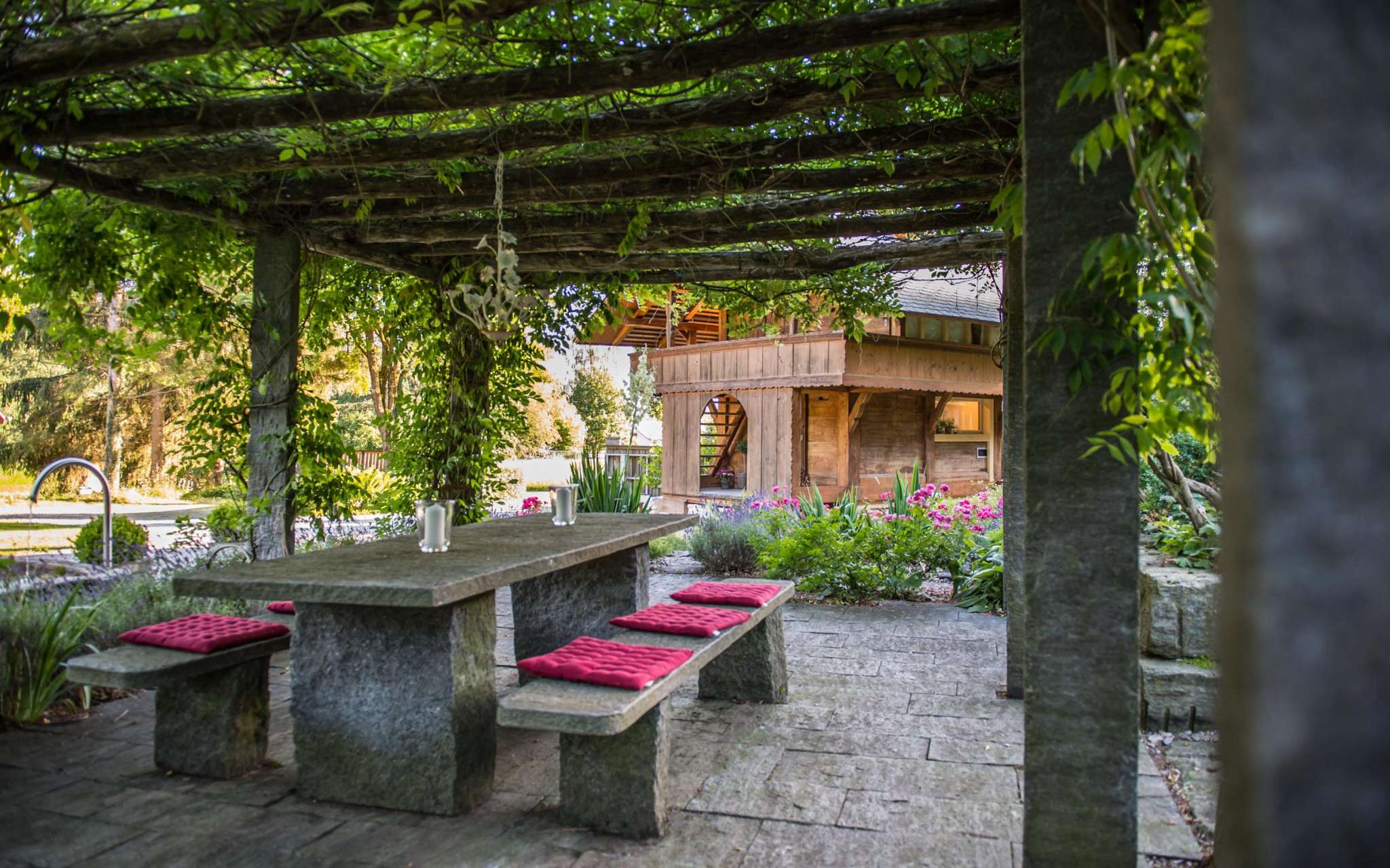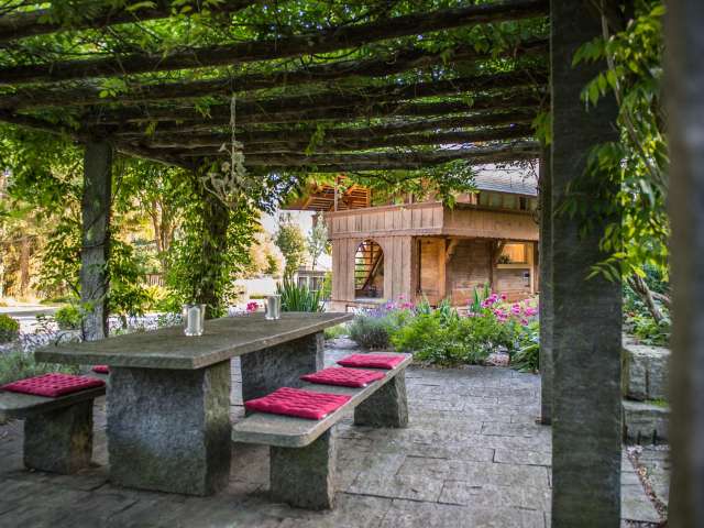 Der alte Spycher weilt in einem grosszügigen Garten samt Pergola zur Mitbenutzung. Parkplatz direkt neben dem Haus vorhanden.