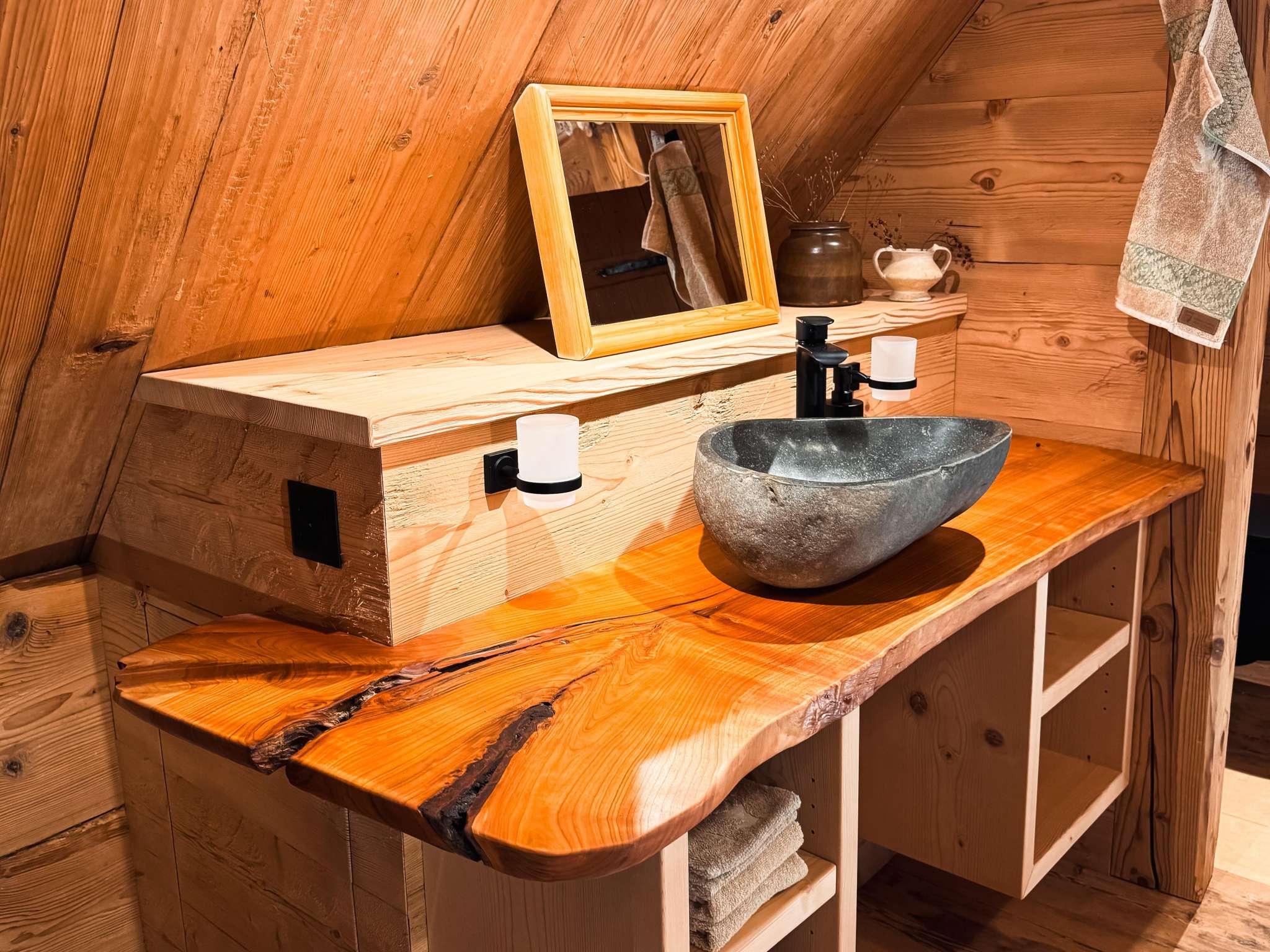 Der 1733 erbaute Speicher wurde 2024 komplett renoviert und hat dabei seinen charmanten Charakter beibehalten. Das Holzhaus strahlt Gemütlichkeit aus und bringt einem zurück zu den Wurzel und zur Natur. Das denkmalgeschützte Haus ist nicht beheizt, Wärme spenden dafür die Alpaka-Wollduvets, ein Lagerfeuer oder eine herzliche Umarmung der Mitreisenden.