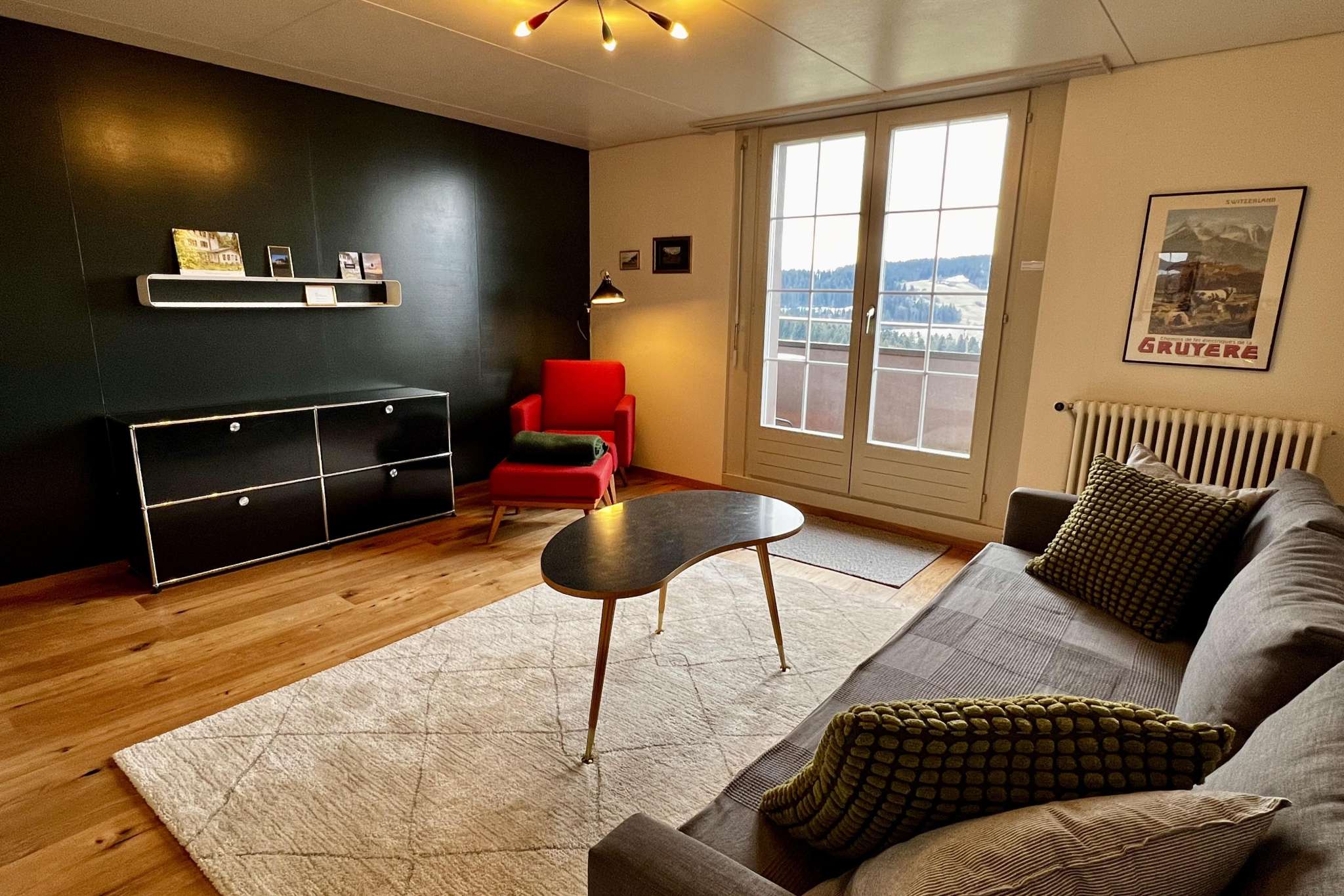 Die Ferienwohnung ist ideal für 1 – 2 Personen, befindet sich im 2. Stock und bietet eine fantastische Aussicht über die Hügel des Emmentals. Die Wohnung verfügt über ein Wohnzimmer mit Balkon, einer kleinen Küche, einem Schlafzimmer mit Doppelbett und ein Badezimmer mit Dusche. Haustiere sind nicht erlaubt. Details und Buchungsmöglichkeiten finden sie auf der Website.