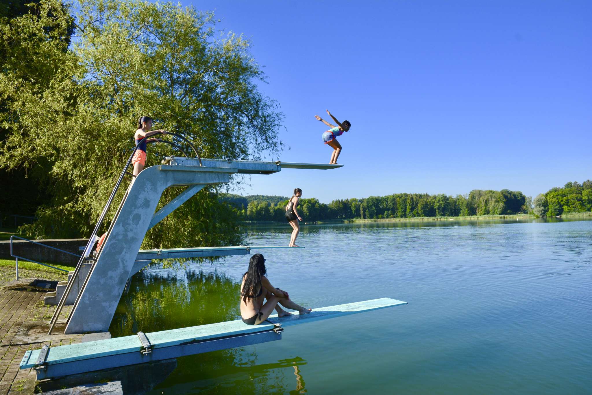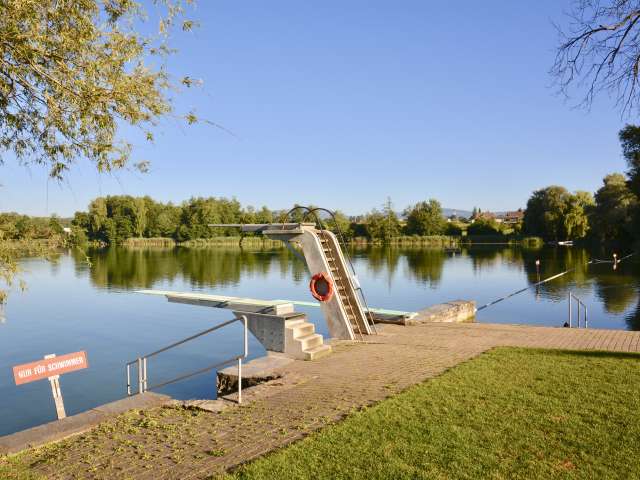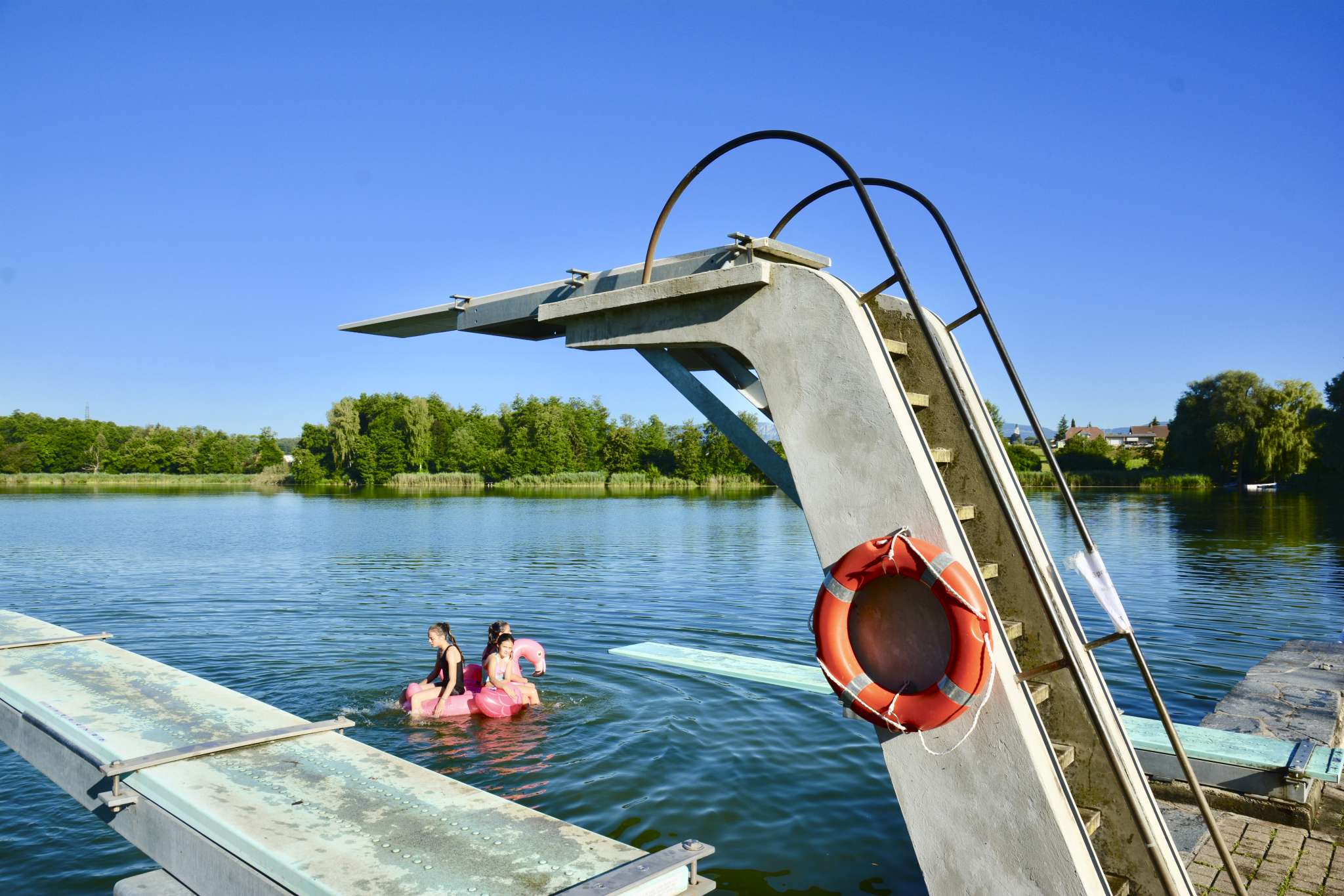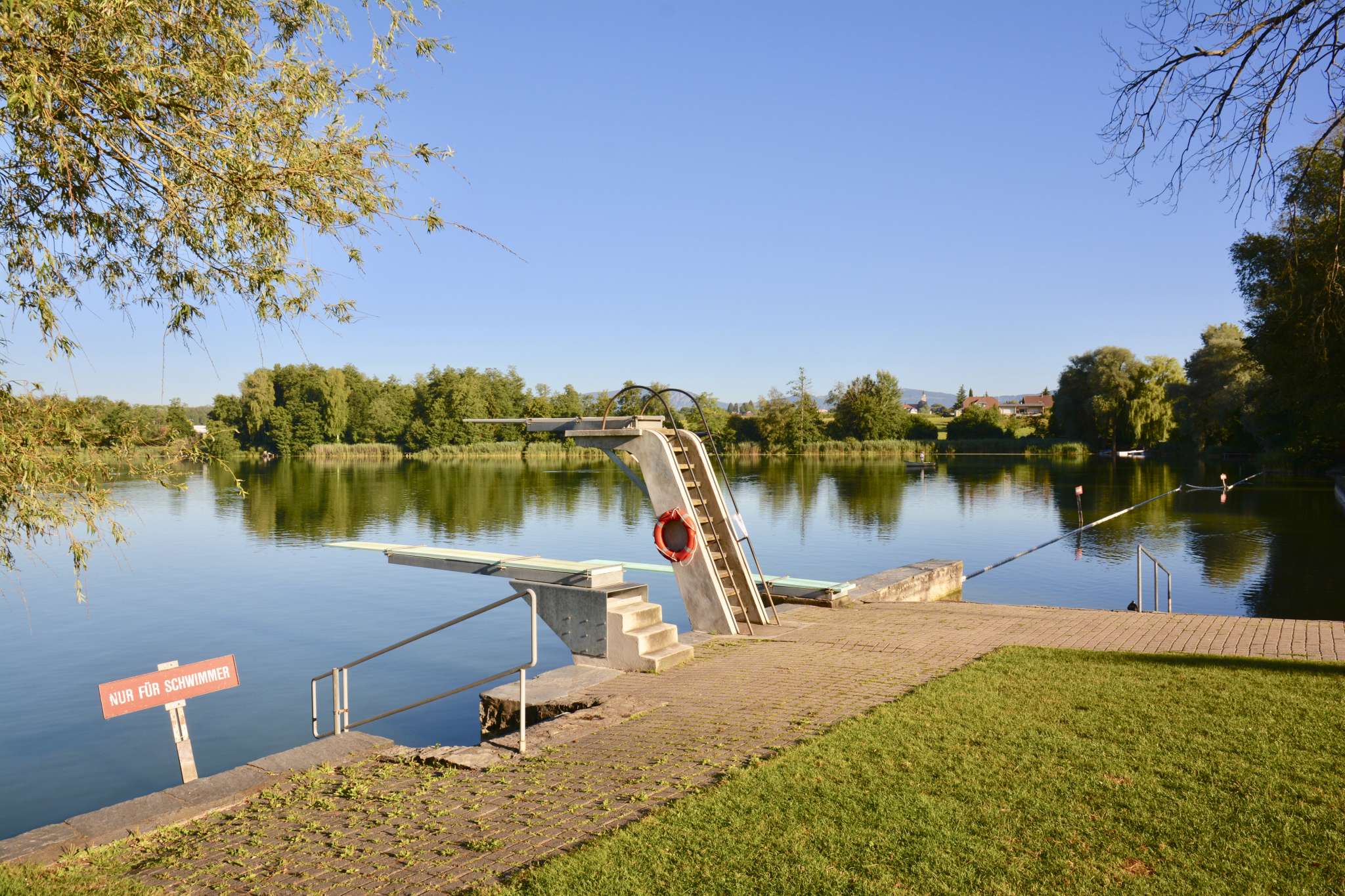 Für geübte Schwimmer befinden sich auf dem See zwei verankerte Holzflosse zum ausruhen oder sonnen. Zum reinspringen steht ein 1-Meter- und 3-Meter-Sprungbrett zur Verfügung. Das Kinderplanschbecken wird täglich frisch mit Seewasser aufgefüllt. Die grossen, stattlichen alten Bäume spenden natürlichen Schatten. Im kleinen Kiosk des Schwimmbads gibts allerlei zum Naschen, Glaces, Kaffee und kleine Snacks.