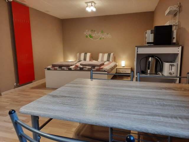 - Doppelbett, Schlafsofa, Esstisch, Kaffeemaschine,Mikrowelle, Kühlschrank, TV und kostenlosem WLAN. Eigenes Badezimmer, Dusche und WC. Die Sauna kann gegen eine Gebühr dazu gebucht werden.