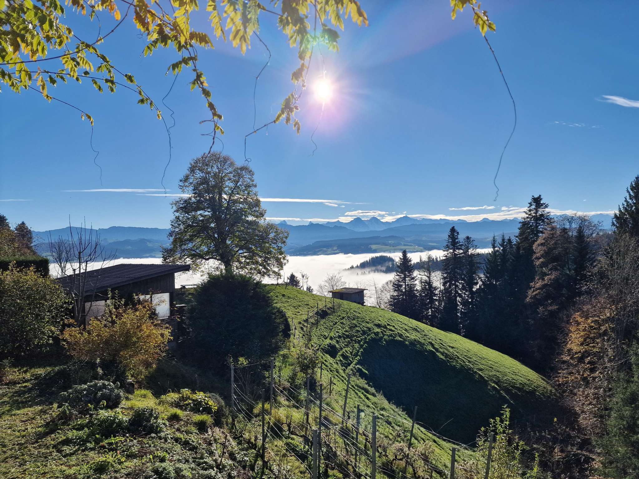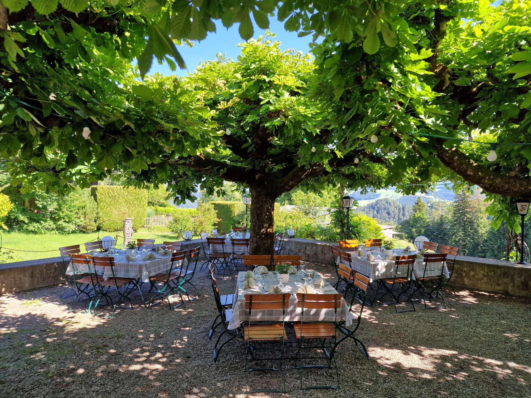 Im Sommer können Sie unter den Schatten spendenden Kastanienbäumen in der lauschigen Gartenwirtschaft sitzen. Vor Ihnen liegen die traumhafte Hügellandschaft des Emmentals und die gewaltige Berner Alpenwelt.