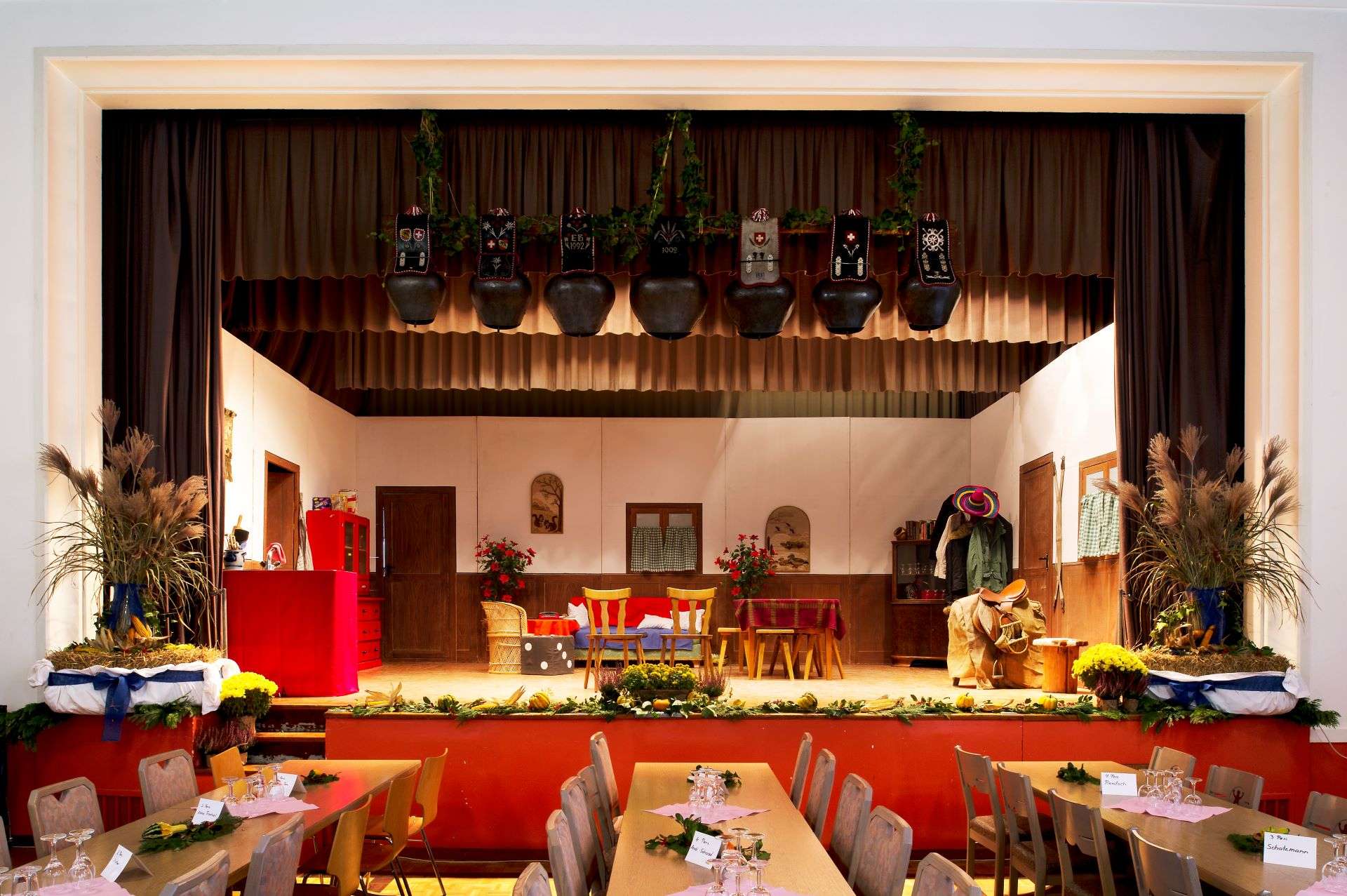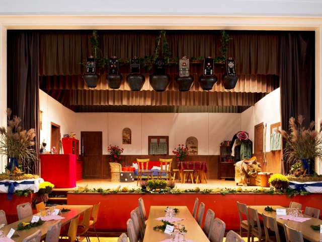Im 1. Stock findet man den grossen Saal mit seiner stattlichen und immer wieder genutzten Theaterbühne. Hier können an Banketten, Seminaren, Hochzeiten, Versammlungen, Weihnachtsessen und anderen Anlässen, problemlos bis 180 Personen die vorzügliche, gutbürgerliche Küche der Familie Kirmizitas geniessen.