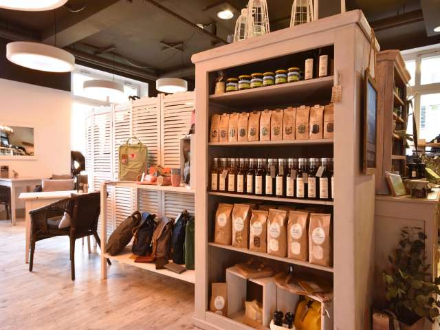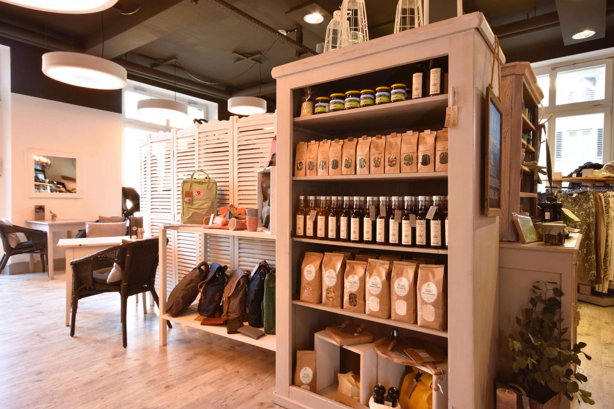 In diesem schön gestalteten Café finden Sie gleichzeitig Secondhand Kleider und eine kleine Boutique mit nachhaltigen Produkten.