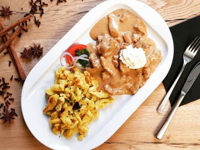 Das Dorf-Hotel mit 15 Zimmern und reichhaltigen Speisen.
