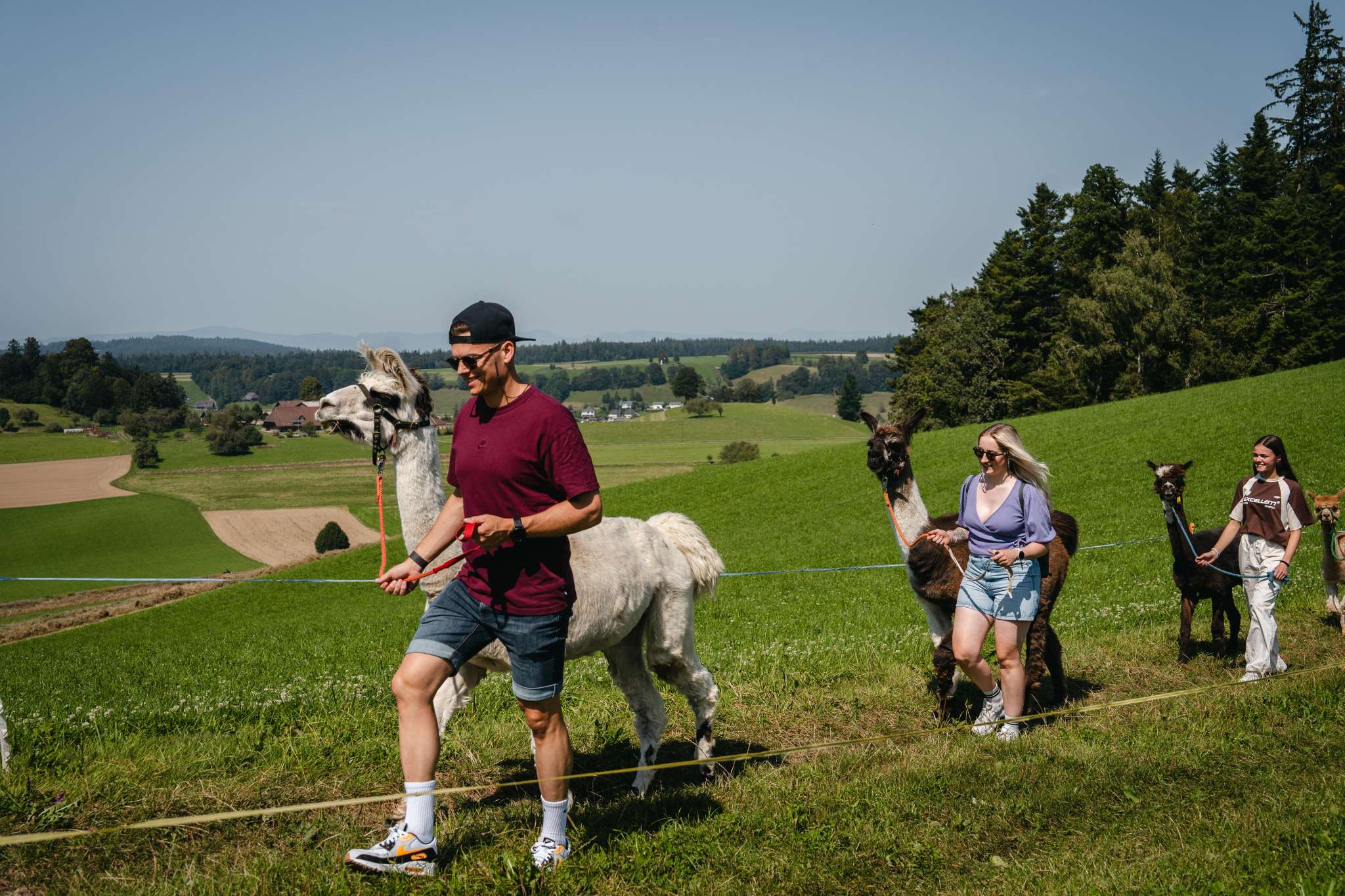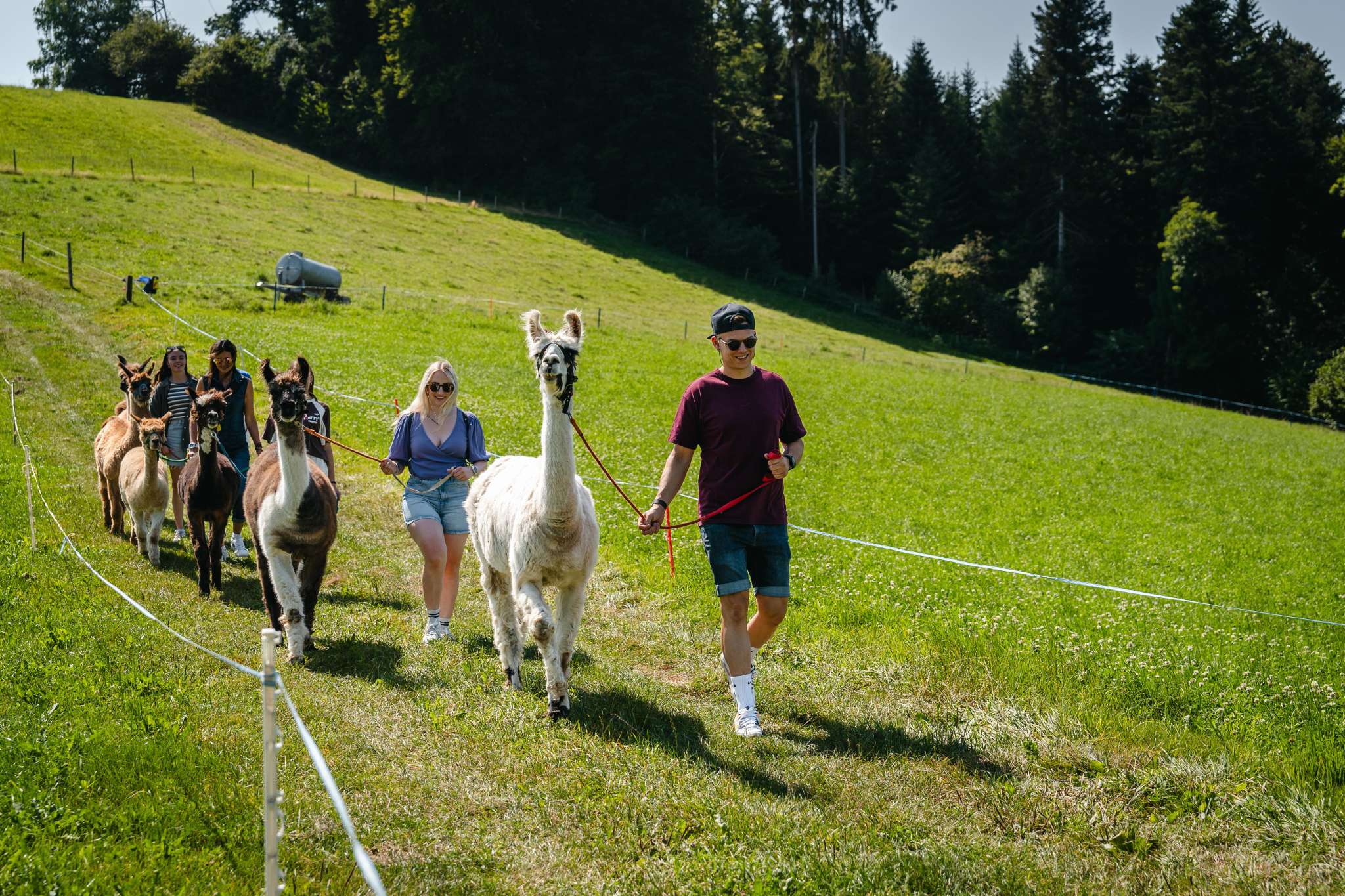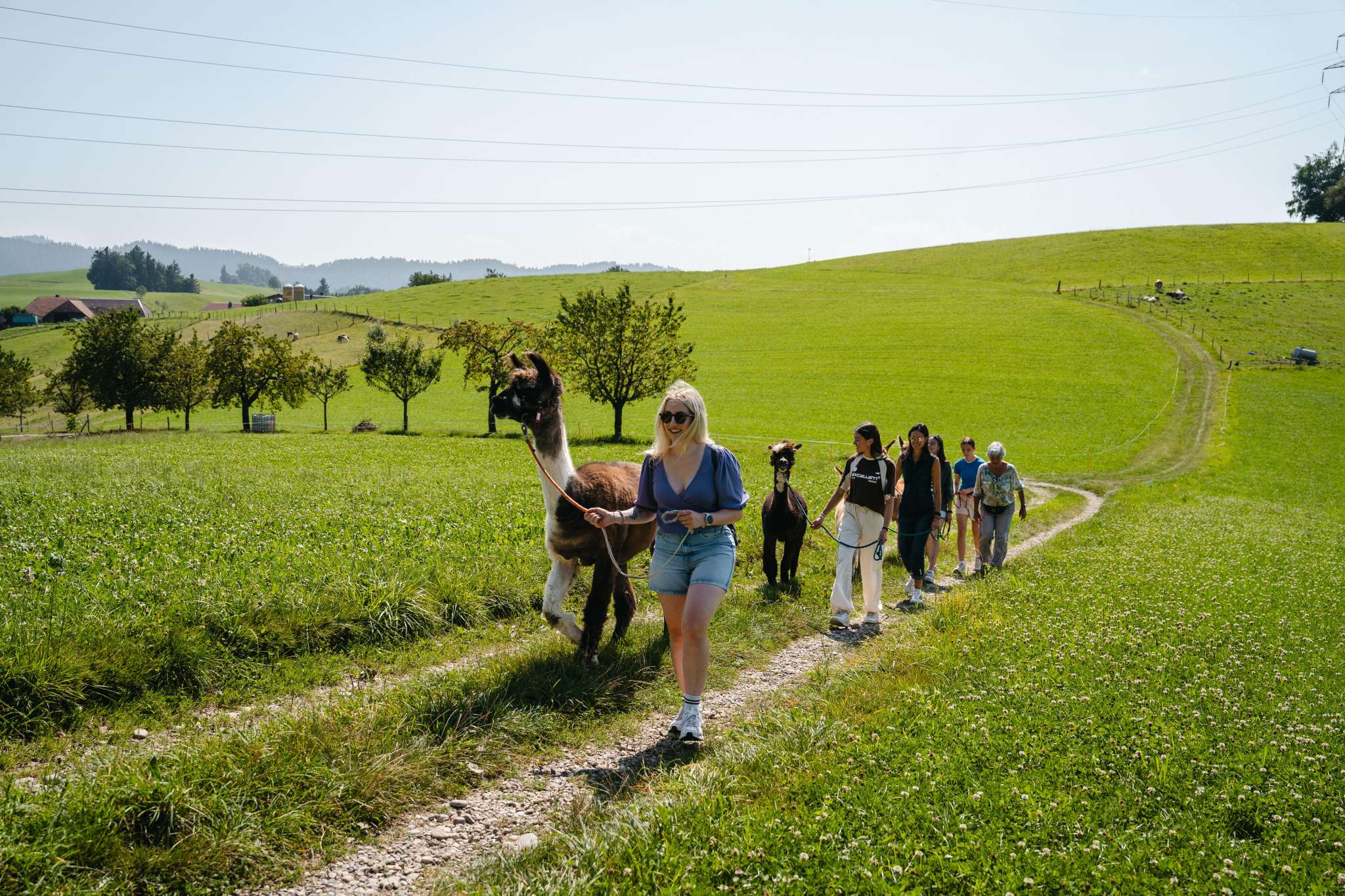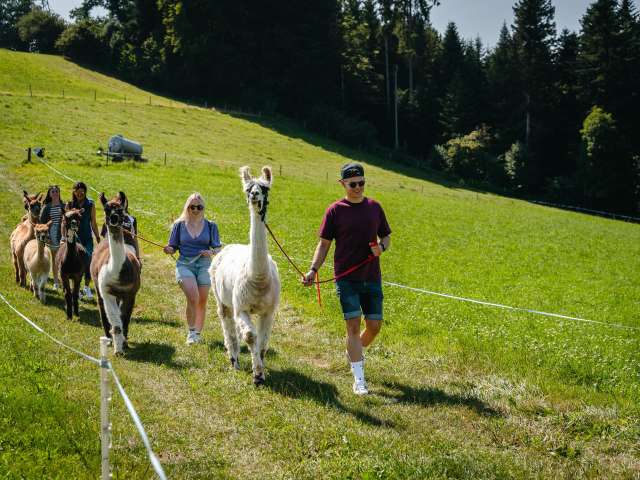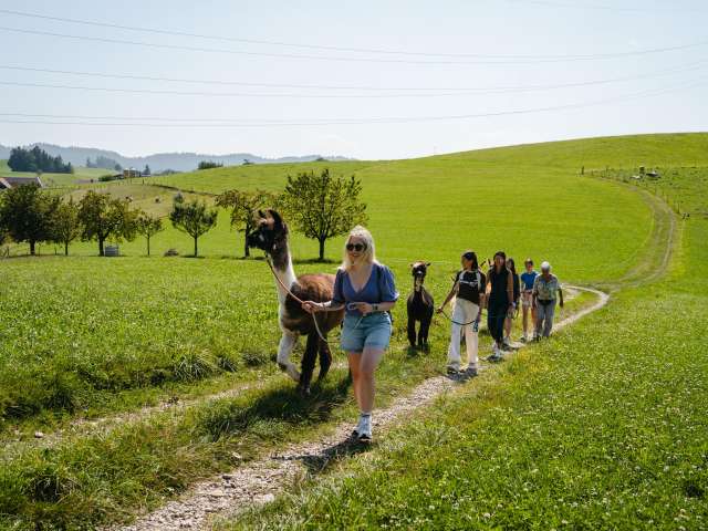 Lamas, die zur Gattung Kamele gehören, sind in Südamerika beheimatet. Das schweizerische Klima behagt ihnen sehr. Ihr sanfter, gutmütiger Charakter begeistert immer wieder. Auf dem Lamahof Tschäppel können Sie mit den Tieren näher in Kontakt zu kommen und eine Wanderung mit den Lamas und einer Begleitperson zu unternehmen Die Lamawanderungen sind als Gruppenaktivität buchbar. Einzelpersonen können sich bei den rund 12 öffentlichen Lamawanderungen pro Jahr anmelden.