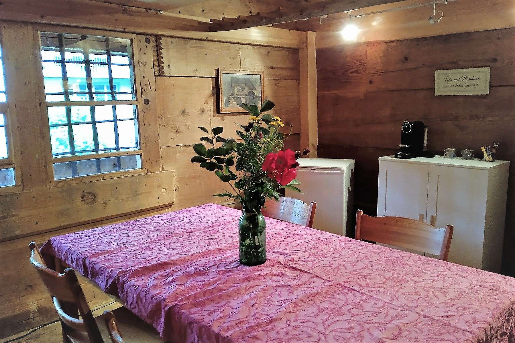 Das idyllische Plätzchen hinter dem Spycher lädt zum Verweilen ein. An dem grossen Holzstich kann die selbst zubereitete Mahlzeit genossen werden und dabei mit Glück noch das Zirpen der Grillen und das Vogelgezwitscher belauscht werden. Das aussergewöhnliche am Spycher ist das Mühlebächli, welches unter dem Spycher hindurchfliesst. Das leiste Plätschern des Baches lädt zum Geniessen und Verweilen in der Natur ein.