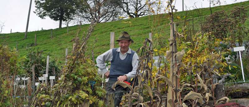 Sie nennen ihn den Herrn der tausend Kräuter. Aber tatsächlich hat er vieles mehr: Der Landwirt und Hobbygärtner Hans Zaugg, aus dem Weiler Liemberg ob Rohrbachgraben BE sammelt nicht nur Heil- und Giftkräuter, sondern auch Bauerngartenstauden, Gräser und Färberpflanzen sowie besondere Büsche und Bäume, zu denen er eine Beziehung hat. Aber vor allem sammelt er kleine Gewächse: Sachen, von denen ausser ihm kaum jemand mehr weiss, wie sie heissen, geschweige denn eine Idee hat, wozu sie dienen könnten. So habe ich auf dem Liemberg meinen ersten Hanfartigen Hundswürger (Apocynum cannabinum) mit seinen typischen bohnenartigen Balgfrüchten gesehen. Ich habe am Venuskamm – auch Nadelkerbel (Scandix pecten-veneris) genannt – gerochen und ein Zweiglein des kleinen Würzkrautes zwischen meinen Fingern zerrieben. Ich habe die zart gestreiften rosaroten Blüten der Berg-Esparsette (Onobrychis montana) bewundert und eine unglaublich schöne Anatolische Nelke (Dianthus anatolicus) gesehen, die mir vollkommen neu war.