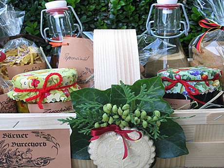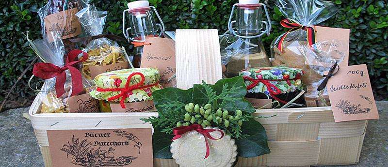 Eine vielfältige Auswahl an köstlichen regionalen Produkten, die sowohl in Geschenkkörben als auch in Geschenkboxen erhältlich sind. Die Spezialitäten stammen direkt aus den Häusern, Höfen und Gärten der Bäuerinnen unserer Region. Ein Geschenk mit diesen Genüssen ist immer eine grossartige Idee und bereitet Freude.