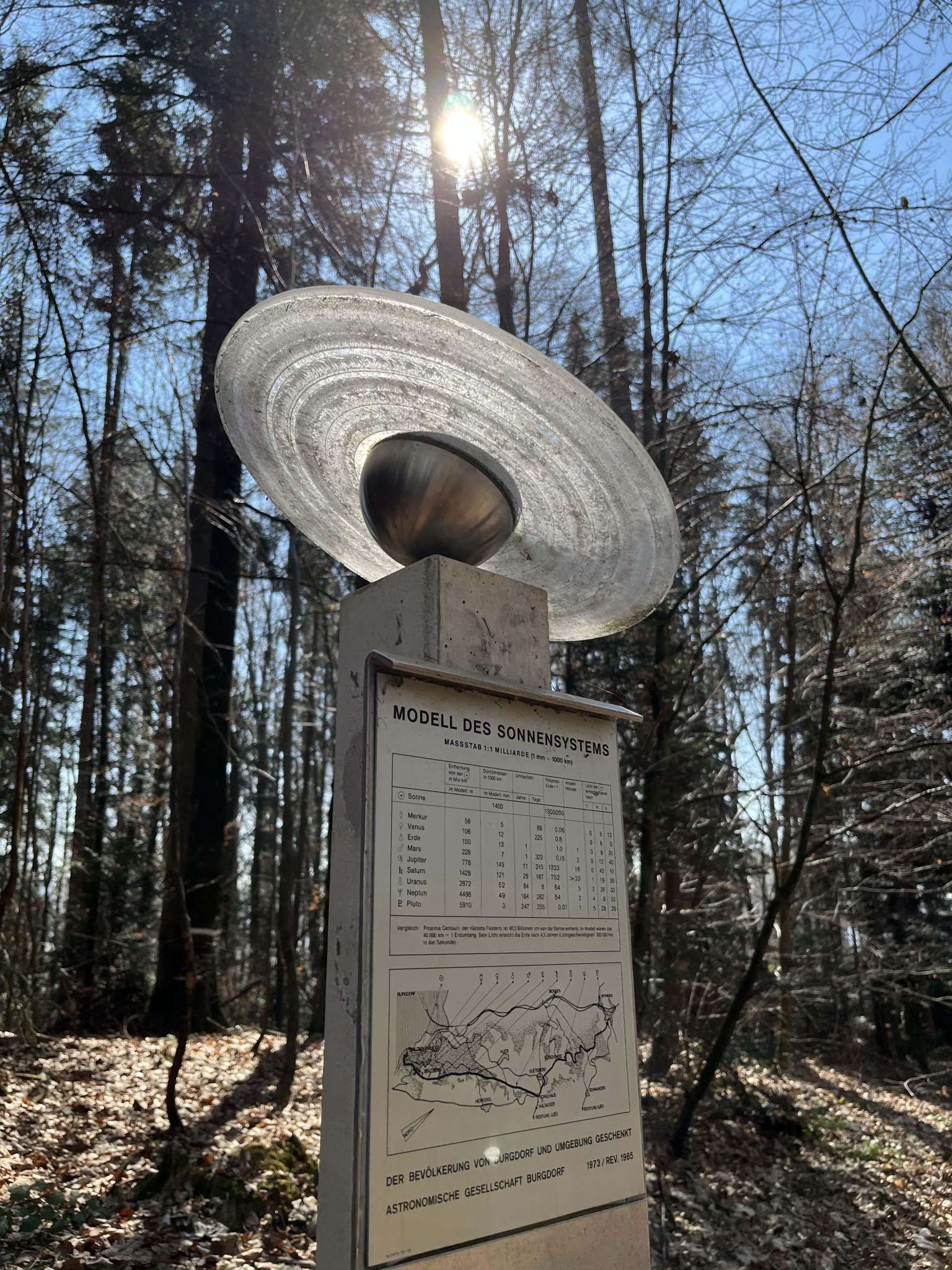 Entdecken Sie die Grössenverhältnisse unseres Sonnensystems auf dem Planetenweg Burgdorf. Im Massstab von 1:1 Milliarde wird, durch ein auf einer Strecke von rund 6 km verteiltes Freilichtmodell, die Grösse der Sonne und der Planeten sowie die Entfernung der Planeten von der Sonne gezeigt.