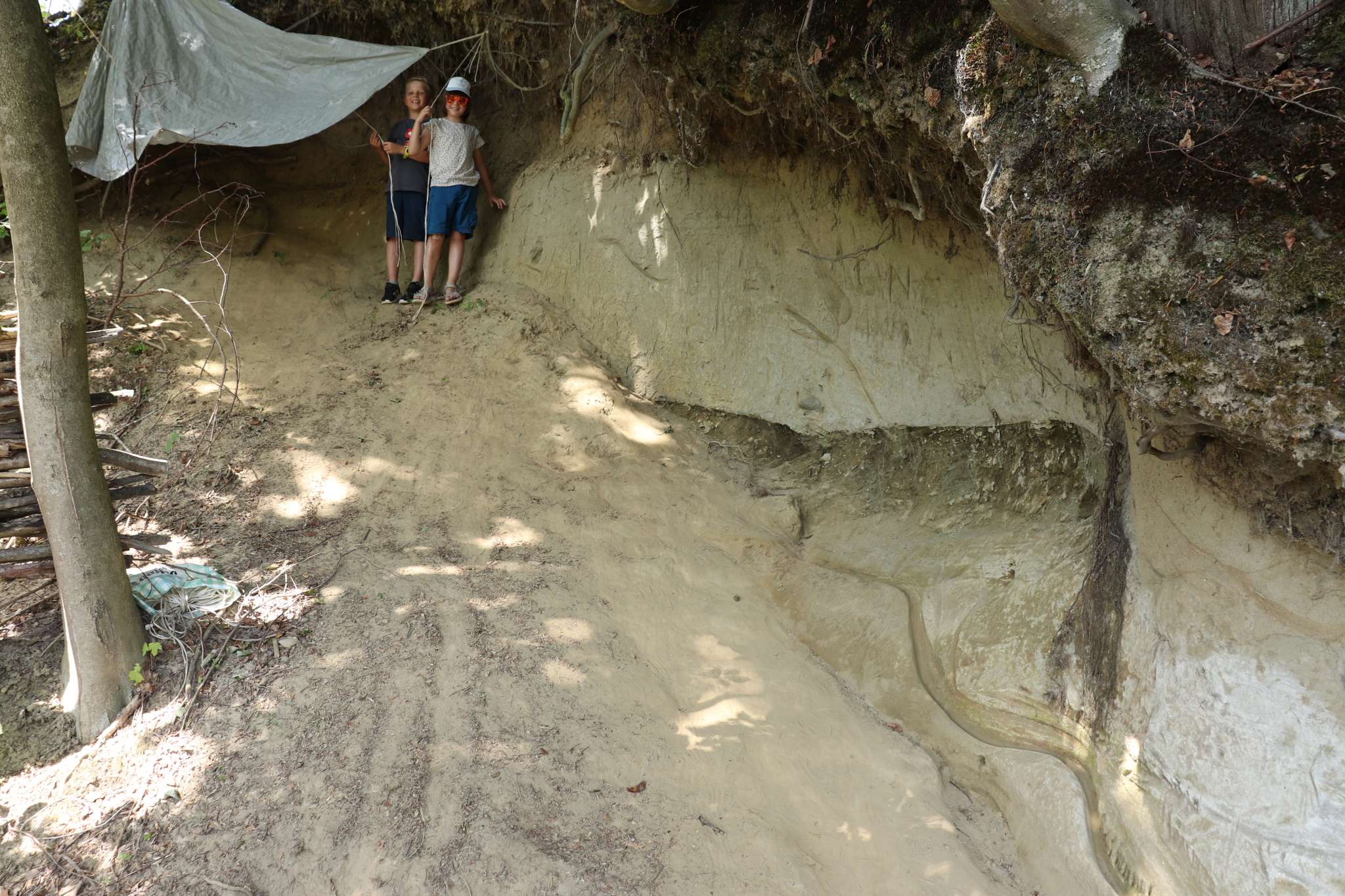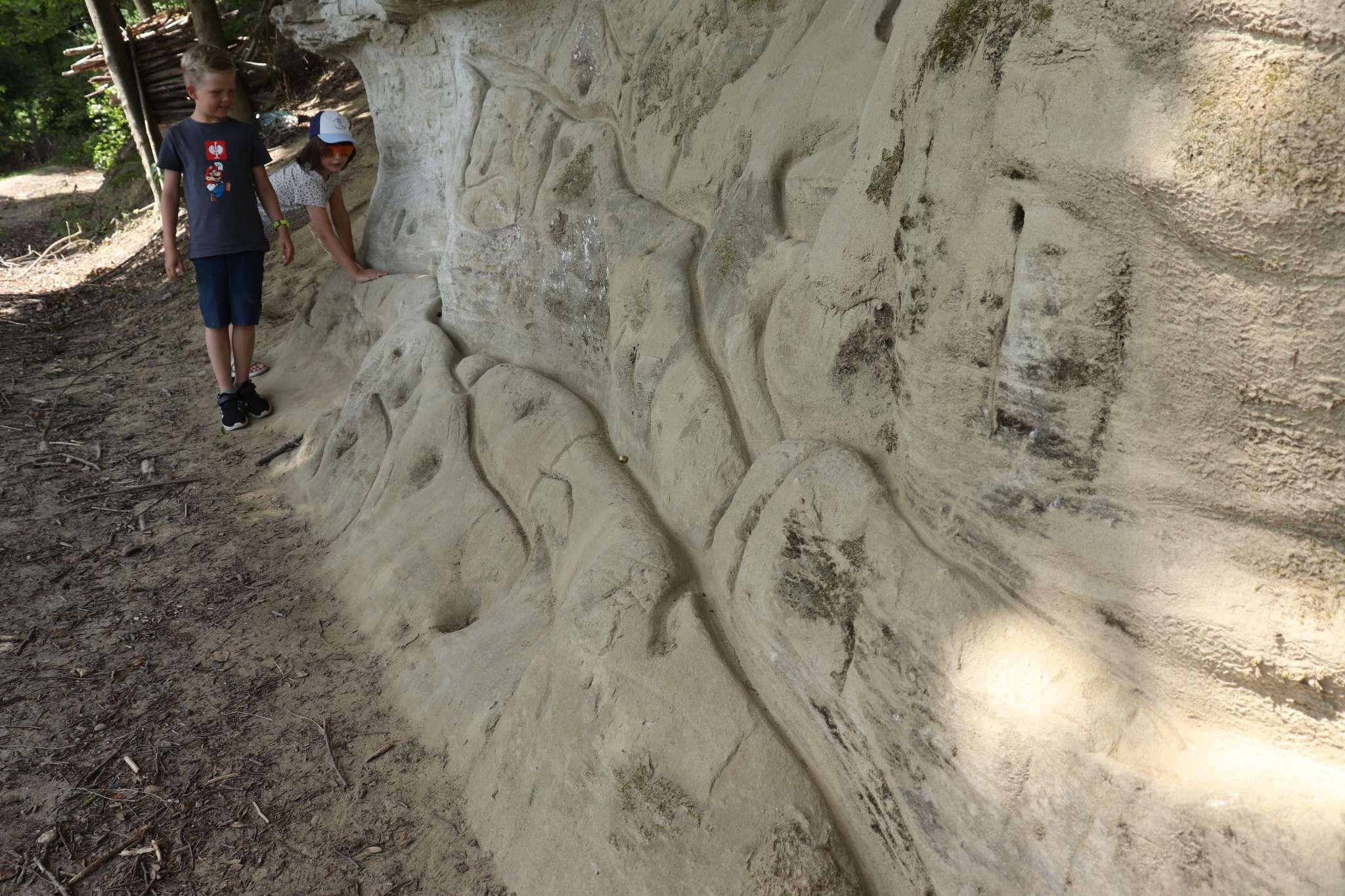 Der Sandstein ist ziemlich murb. Deshalb sollte man hier nicht darauf herumklettern. Und nun müssen die Bahnen erst mal gereinigt werden. Dann kann der Test losgehen: Welche Murmel bleibt am längsten in der Bahn? Das Resultat: Die kleinen kommen am weitesten. Und eine weitere Erkenntnis: Es lohnt sich, genug Murmeln mitzunehmen. Denn springt eine aus der Spur, ist sie schnell über den Wanderweg gehüpft und verliert sich im abschüssigen Waldboden.