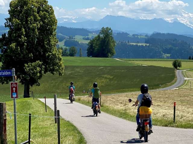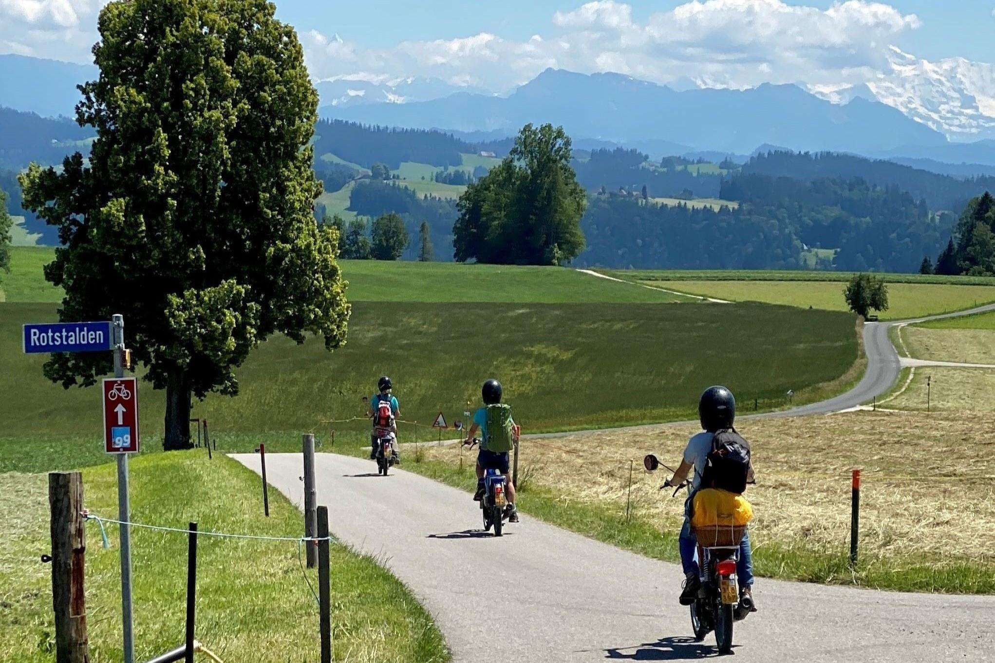 Töffli-Feeling wie in jungen Jahren mit atemberaubenden Aussichten auf die Berner Alpen! Lassen Sie sich klimaneutral und mit neuster Katalysator Technik in Ihre Jugend zurückversetzen. Mit unseren Töfflis fahren Sie ab der Emmentaler Brauschüür auf verkehrsarmen Strassen Richtung Heimisbach, Sumiswald, Lützelflüh, Moosegg und in einer Schleife zurück zur Brauerei. Feiern Sie Ihr Abenteuer bei einer Aftertöffliparty mit Bier, Pizza oder Burger in der Brauschüür.